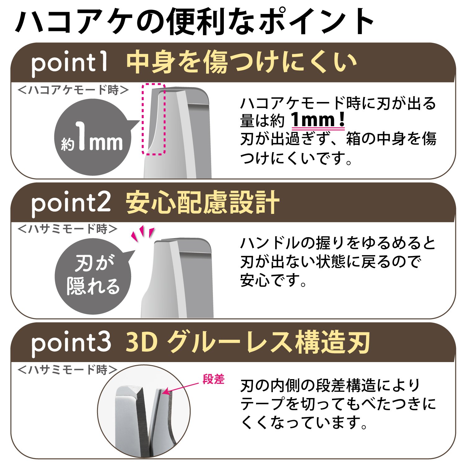 You can switch between the two modes, "scissors mode", and "Hako Ake mode" which can be pulled while grasping the blade.