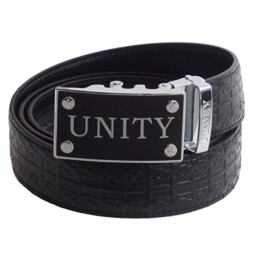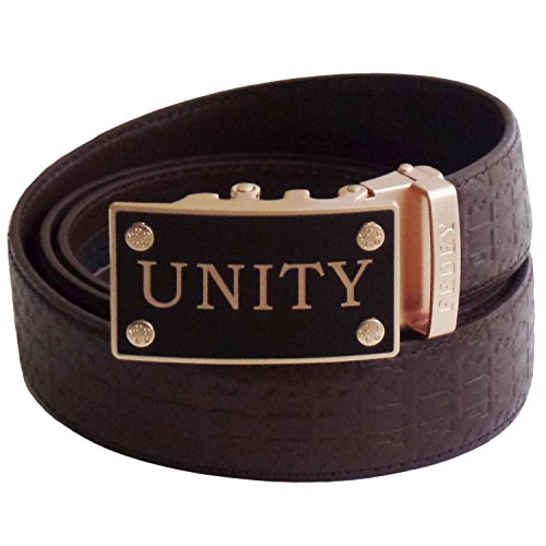 FEDEY signature series mens automatic genuine leather ratchet belt with UNITY buckle. This Statement belt comes with the signature ratchet belt strap. Strap is 1.4" wide (slightly wider than a dress belt) and the automatic buckle is roughly 1.6" wide by 2.7" in length. FEDEY belt straps are available in three sizes (M, L, XL) to limit the need for any cutting (if needed you can easily cut with scissors). Select Medium for waists up to 38", Large for waists up to 44" and XL for waists up to 54". The belt features a ratchet system with 38 ¼" grooves and an automatic buckle requiring no pin holes. Whether you ate more than your fair share at lunch or dinner, or go up or down in size, you can easily adjust your belt to fit. Straps are made with genuine leather, TOP GRAIN, with robust stitching, and buckle is made with durable zinc alloy with a fashionable gold tone or silver tone surround. All FEDEY Statement Belts come in a gift box along with a microfiber cleaning cloth so you can keep your buckle looking clean and shiny. We also provide a 90 day satisfaction guarantee. If you are not happy with your selection please contact our customer service for free exchange or refund.Feature