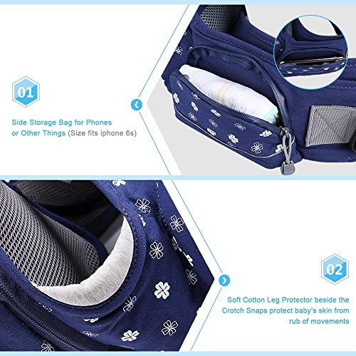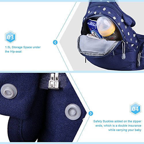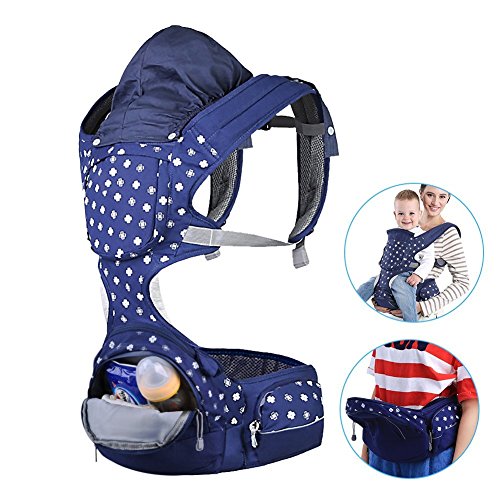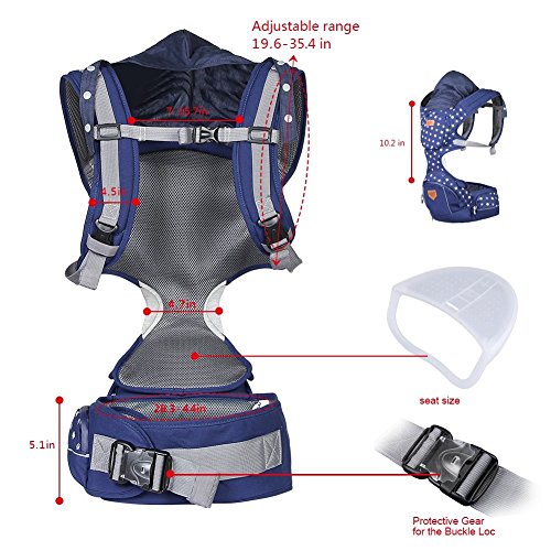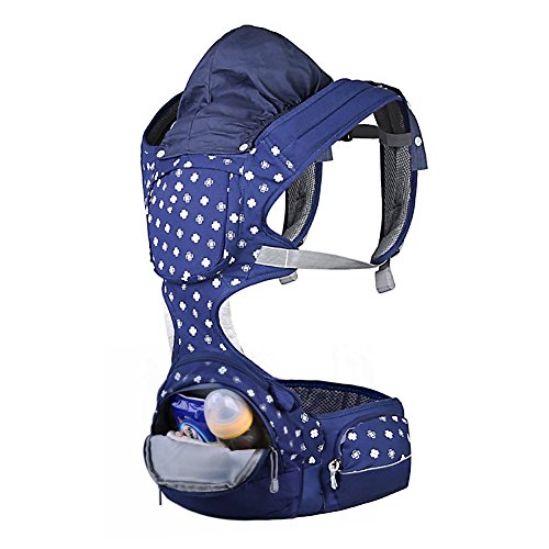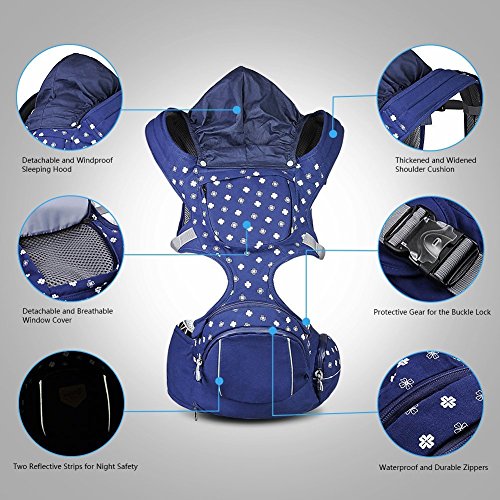 -. Feature : Material: Cotton plus Mesh Fabric; Usable Age: 3-36 month; Usable Weight: 7lbs-44lbs(3.5kgs-20kgs); Waist Size: 72-112cm(28"- 44"); Certification: SGS; Patterns: Four-Leaf Clover- "Hope, Lucky and Safety", delivers parents' best wishes to their babies / Ergonomic Hip Seat Design: This was designed base on the C+M ergonomic P.R.Inciples, which would not force babies' spines or hurt them by incorrect positions. Its design can help prevent issues with muscle and bone development and abnormal leg curvatures / Many positions for your baby wearing: Hip-seat Only- baby could see all around and its good for nursery; Inward Facing or Outward Facing Front Carry- carrying baby around with an enhanced bond between you and baby; Back Carry- hands free and enable you do your own work / 1.5L Front Storage Bag and another side pocket on the waist belt: there is no need to carry bottle holder when you take you baby out with you. The storage space give you an easier access to baby bottle, soothers, snacks, wallet, keys or your phones / Come with detachable hood and airflow panel: for the cool days, you could zip the airflow on and use the hood to protect your baby from winds; in summer time, they could be taken off, the mesh fabric would bring a lot of air flow. Its loose ends would help you get the extra straps organized