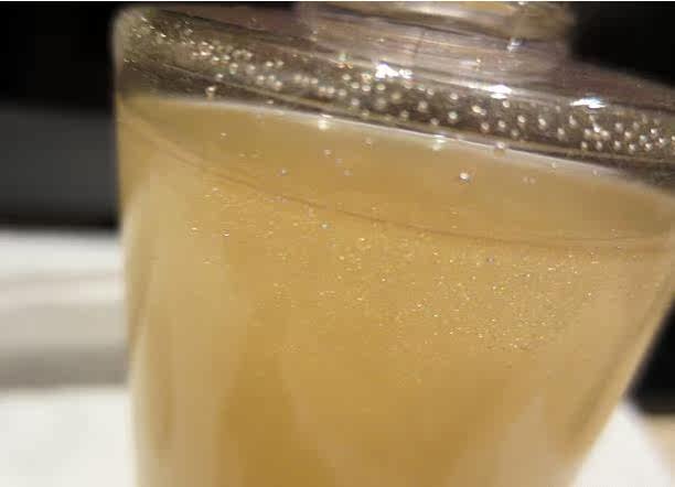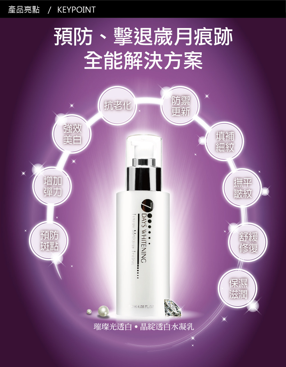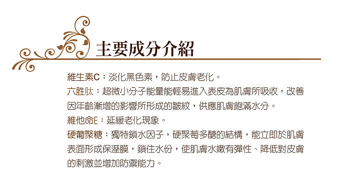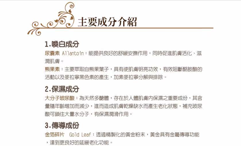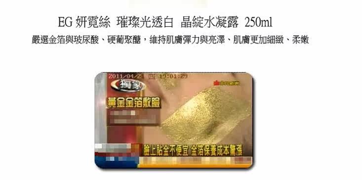 闪亮亮的成分,是奈米金箔,他带有微量的电能,透过轻轻的按摩与肌肤结合后,金箔可以像磁铁一样把熊果素吸到肌肤深层去打击黑色素,做到深层美白的效果。