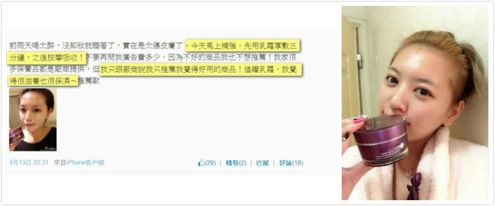 台湾的艺人 李妍瑾把滋养霜当成熬夜霜在使用