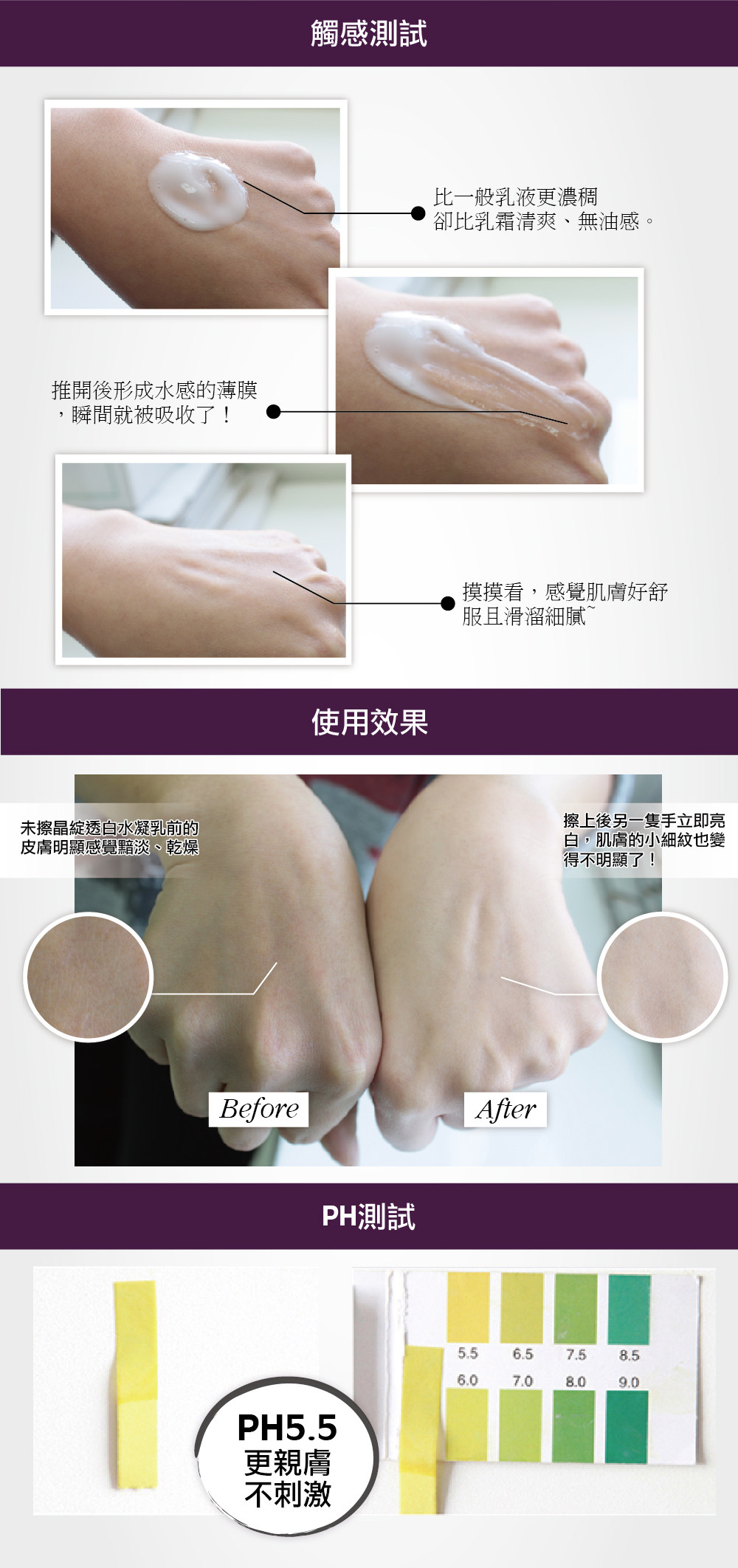 玻尿酸可以抓住500倍的水份,让皮肤瞬间感觉很透明保水、重点是他非常好吸收,吸收后会感觉皮肤非常的滑嫩(建议使用后比较一下,两支手的触感会非常的有落差,一支手会明显非常滑嫩)