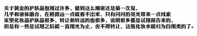 重点她一瓶有250ml,雅诗兰黛大概同款120ml,就要四五百了,重点来了,可以在家自己买压缩面膜纸,假日有空的时候自己做黄金敷脸!!!!金箔肤脸在外头没有3000RMB,是不可能的,但天天自己在家敷黄金,CP值超级无敌高呀