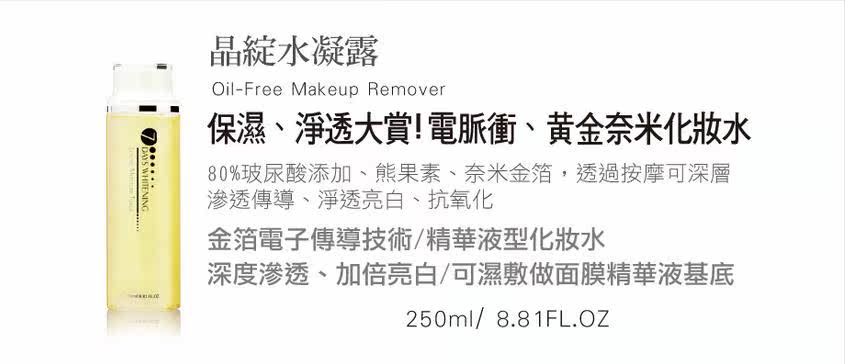 這個是台灣的一個貴婦辣媽推薦的!含有納米金箔成分,所以叫貴婦水,也叫黃金水,它帶有微量電能,主打金箔電子傳導技術,輕輕按摩之後,金箔可以像磁鐵一樣把熊果素推到肌膚深層去消滅黑色素,吸收的特別快,塗完之後馬上塗精華,美白補水效果一級棒,用過之後皮膚特別嫩。