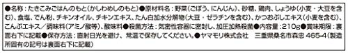 原材料:野菜(ごぼう、にんじん)、砂糖、鶏肉、しょうゆ(小麦・大豆を含む)、食塩、でん粉、チキンオイル、チキンエキス、たん白加水分解物(大豆・ゼラチンを含む)、かつおぶしエキス(小麦を含む)、こんぶエキス/調味料(アミノ酸等)、酸味料
