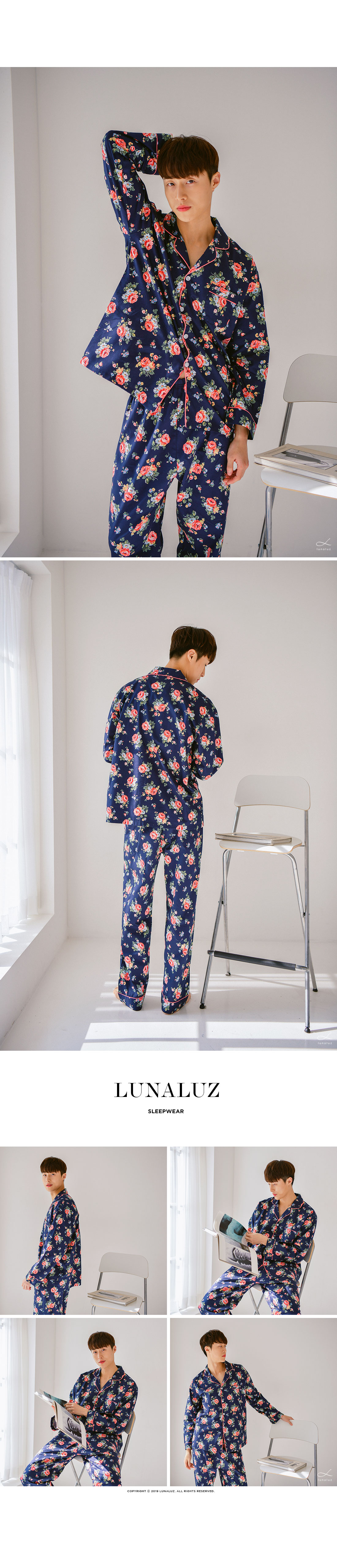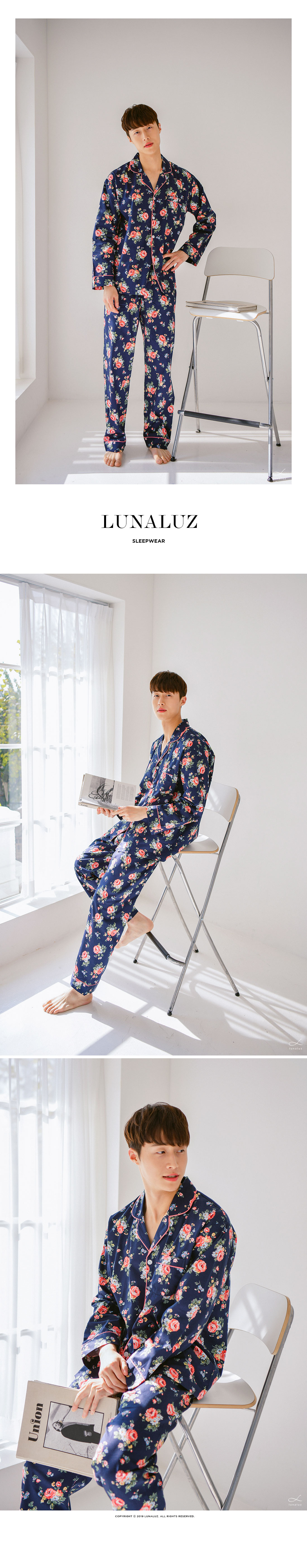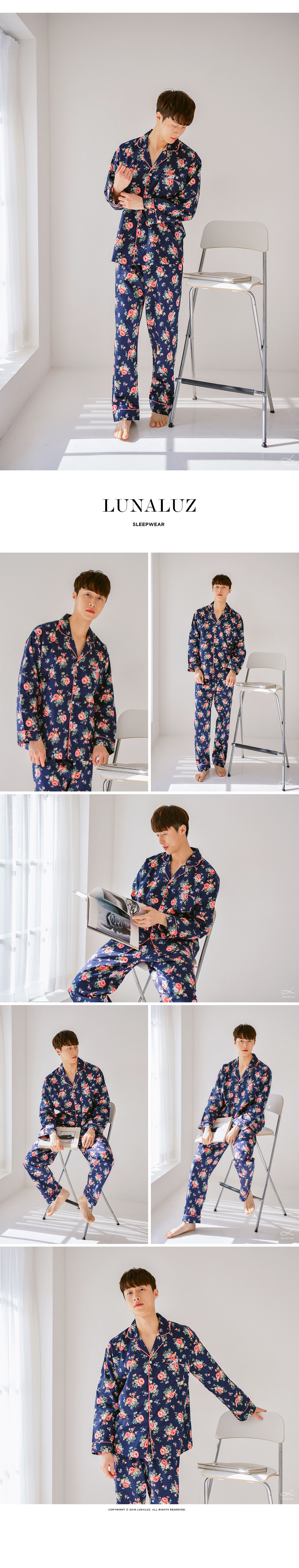 깔끔하고 단정한 네이비 컬러를 베이스로 플라워 모티브를 큼직하게 넣어 화사하게 포인트를 주었습니다. 탄탄하고 매끈하면서 윤기가 있는 40수 트윌면으로 착용감 뿐만 아니라 퀄리티가 좋답니다. 면이라 피부에 닿는 느낌이 매끈하고 부드러워 숙면을 취하기 좋습니다. DETAIL 깔끔한 포켓 카라 파자마 스타일의 잠옷입니다. 오묘한 핑크 컬러의 파이핑으로 포인트를 주어 감각적이고 세련된 분위기를 연출할 수 있습니다. ]네츄럴한 핏으로 편안하게 착용할 수 있습니다. 깔끔한 색감, 고급스러운 플라워 모티브, 매력적인 디자인이 참 잘 어우러진 잠옷으로 소장가치가 높습니다. 100%국내 제작으로 소재, 디자인, 봉제의 퀄리티가 높습니다. SIZE남성 잠옷은 100size 기준으로 제작한 free사이즈입니다.