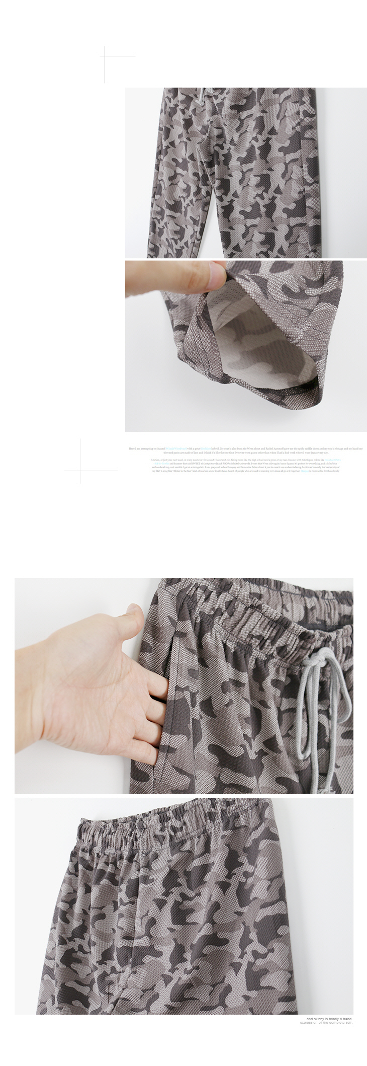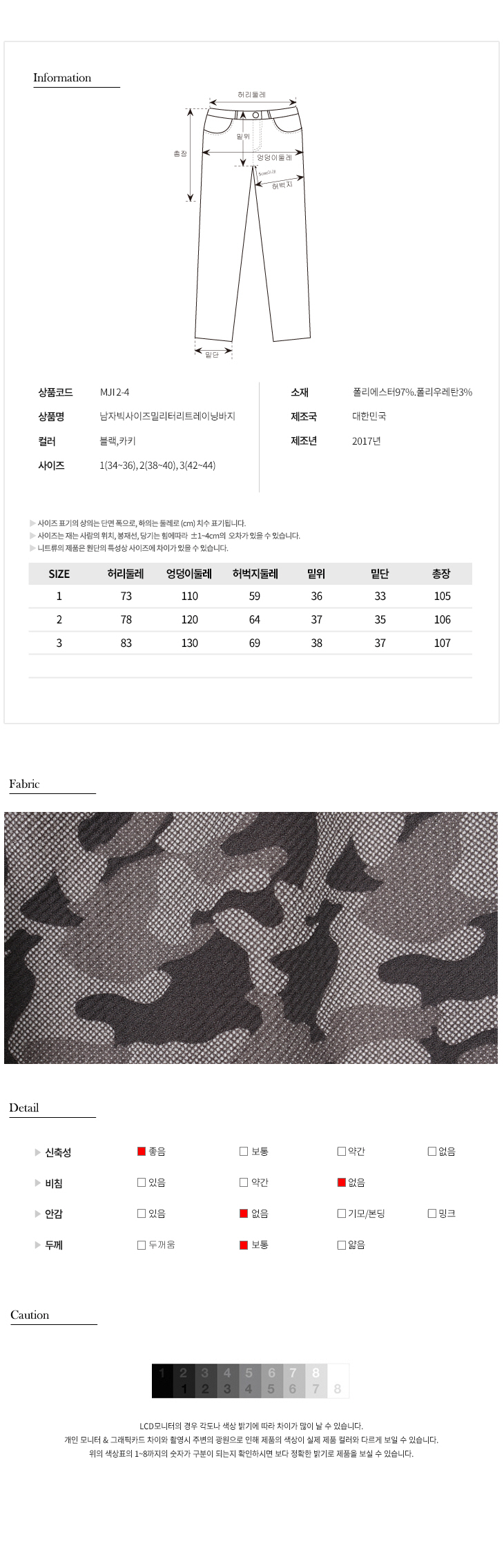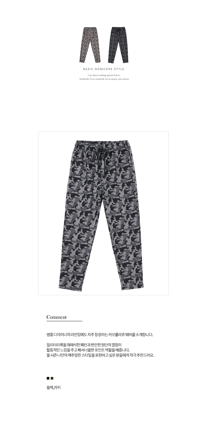▣상품설명 : 명품 디자이너의 라인업에도 자주 등장하는 카모플라쥬 웨어를 소개합니다.밀리터리룩을 재해석한 패턴과 편안한 원단의 결합이 활동적인 느낌을 주고 패셔너블한 포인트 역할을 해줍니다.올 시즌 나만의 캐주얼한 스타일을 표현하고 싶은 분들에게 적극 추천드려요.