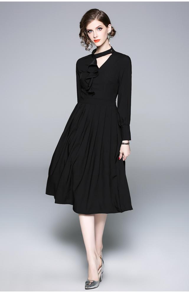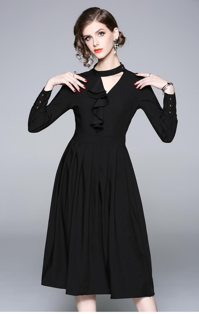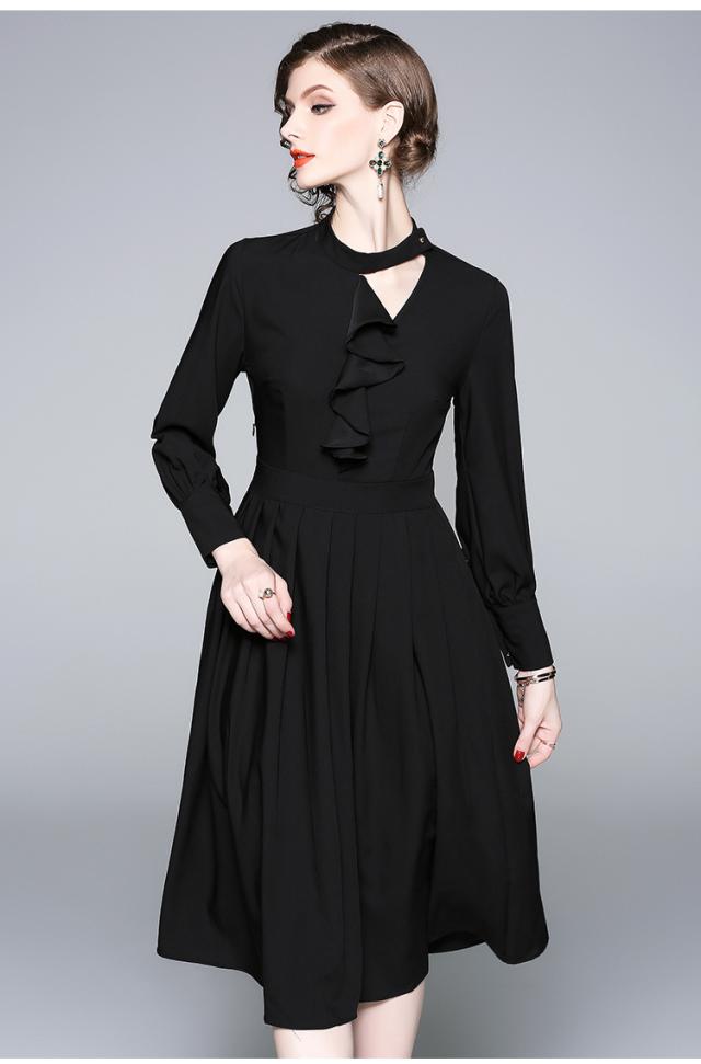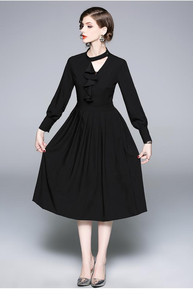 フリル ドレス ワンピース 長袖 フィットアントフレア パーティー 結婚式 二次会 女子会 謝恩会