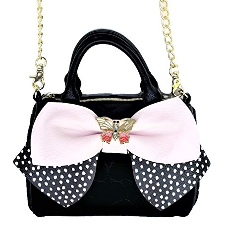 Barrel-shaped Mini Crossbody purse. Exterior 100% Polyester (Velvet) with PU Leather Trim. Printed Floral Polyester inner lining, 1 Inside Slip Pocket. Gold tone hardware. Front accented with a Large bow with a gold tone butterfly with Betsey signature engraved on it. 3 Inch Dual Handle Drop, Single Shoulder Strap With Partial Chain has approx 22" drop. Outside dimensions of the purse: Length 8" X Height 6" X Depth 5.75"