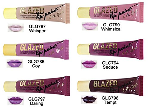 Full 6 COLORS L.A. GIRL LIP GLAZED PAINT GLOSS BEST PIGMENT AND QUALITY You will Receive : Full 6 Colors [786-Coy, 787-Whisper, 790-Whimsical, 794-seduce, 797-Daring, 798-Tempt] Making their much anticipated debut, Glazed Lip Paints give the intensely pigmented appearance of a lipstick, with the ease and glossy finish of a lipgloss. Glazed collection includes 6 of the most sought-after, trendsetting colors this season while providing long lasting, hyper glossy, ultra rich color to lips. - Light colors cool and nourish lips with vitamin E and peppermint oil. Color goes on easy buy pigmented. Not sticky.Feature