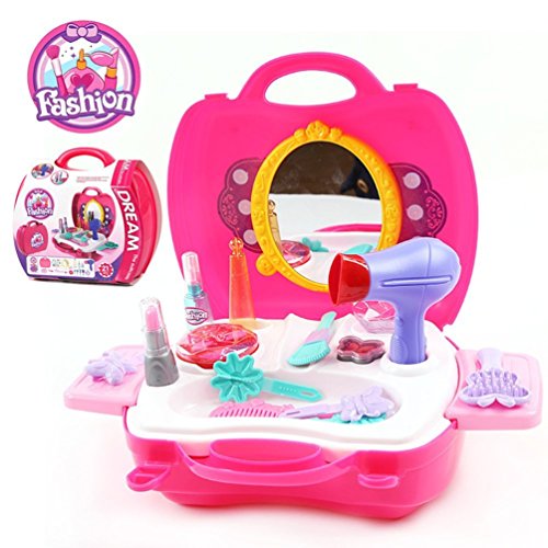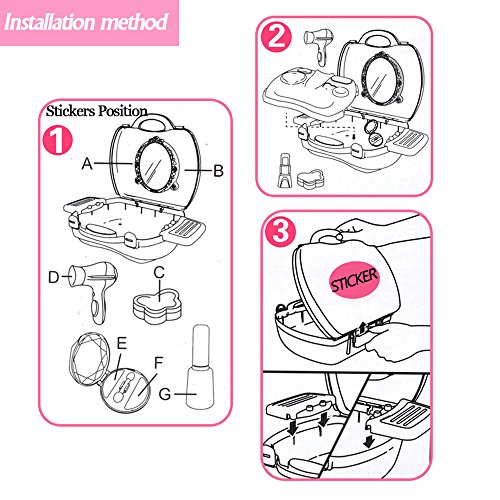 Includes 21pcs pretend compact with---Play Set Includes Hairdryer, Comb, Mirror, MakeUp Palette, Hair clips, Stickers, Lipstick, and Perfume.