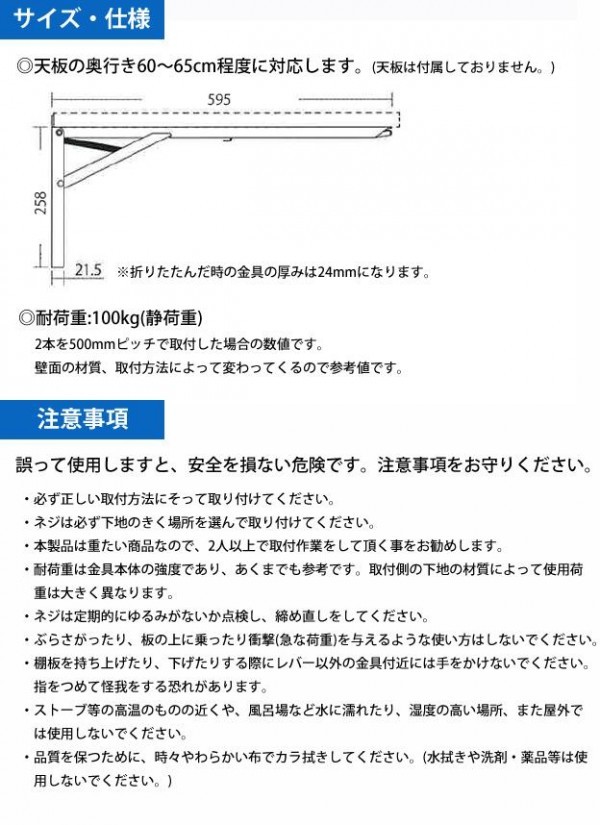 | 付属品 | 棚板取付用(ユニクロタッピングナベ6×18)6本 取付面用(ユニクロタッピングナベ6×40)12本 取付面だるま穴用(ユニクロタッピングナベ4×30)2本 取付面上側用(ユニクロ頭塗装タッピングナベ4.5×40)4本 取付支援用(透明フィルム)2枚 |