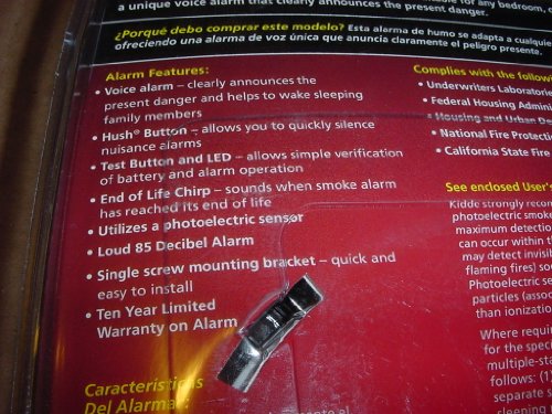 -. Binding : Tools & Home Improvement -. Brand : Kidde -. Color : white -. EAN : 0047871096619 -. Feature : Alarm is under listed and is equipped with a piezoelectric horn that is rated at 85 decibels at 10 ft. / Alarm is equipped with test - reset button, tests the circuitry and horn and resets memory after alarm has sounded / Money savings, no batteries to buy and replace every six months, -. Label : Kidde -. Manufacturer : Kidde -. Model : 21009661 -. MPN : 21009661 -. PartNumber : 21009661 -. ProductGroup : Home Improvement -. ProductTypeName : SECURITY_ELECTRONICS -. Publisher : Kidde -. Studio : Kidde -. Title : Kidde 10-Year Bedroom Sealed Lithium Battery Operated Smoke Alarm with Voice Alert -. UPC : 047871096619