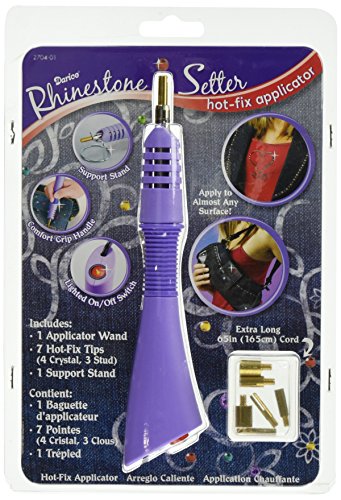 Includes wand, support stand, and 7 hot-fix tips. Wand has a lighted on/off switch and comfort grip handle. Perfect for applying hot fix stones to any surface.