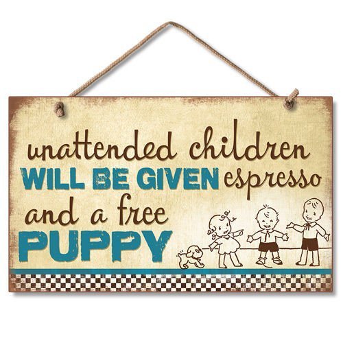 Unattended Children will be given expresso and a free puppy 9” x 6” Wood Sign