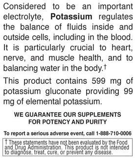 -. Binding : Health and Beauty -. Brand : Natural Nutraceuticals -. Feature : Premium Potassium Supplement contains 599 mg of Potassium Gluconate with 99 mg of Pure and Essential Potassium. Our natural source of Potassium is Vegan, Vegetarian, and Gluten Free. / Potassium is an electrolyte that regulates the balance of fluids inside and outside the cells, including the blood. It is important for heart, nerve, and muscle health. We offer an excellent supplement for those seeking a pure and natural Potassium supplement. / Natural Nutraceuticals supports the Vitamin Angels Foundation, Friend of the Sea Organization, Fair Trade Organization, and Natural Products Association. We are committed to environmental sustainability and social responsibility. Our amber colored recyclable glass bottles are environmentally friendly and best by dates guarantee freshness. Full body, tamper-evident sleeves ensure consumer safety. / Our supplier is located in the USA with the following qualifications: GMP Certified, Friend of the Sea, Fair Trade Certified, USDA Organic, Double Verified Gluten Free, recent recipient of the Diamond Manufacturing Award and a contributing member to the Vitamin Angels Foundation. / Natural Nutraceuticals offers free shipping on orders of $35 or more. We also offer a no questions asked, 30-day money back guarantee. Click the 'add to cart' button to experience the best Potassium available. -. IsAdultProduct : 0 -. Label : Natural Nutraceuticals -. Manufacturer : Natural Nutraceuticals -. MPN : 0712010000 -. PackageQuantity : 1 -. PartNumber : 0712010000 -. ProductGroup : Health and Beauty -. ProductTypeName : HEALTH_PERSONAL_CARE -. Publisher : Natural Nutraceuticals -. Studio : Natural Nutraceuticals -. Title : Natural Nutra - Premium Potassium Supplement - Pure and Potent Electrolyte Formula - Made in the USA - All Natural - Gluten Free - Vegan - Vegetarian - 100 Tablets - 99 mg