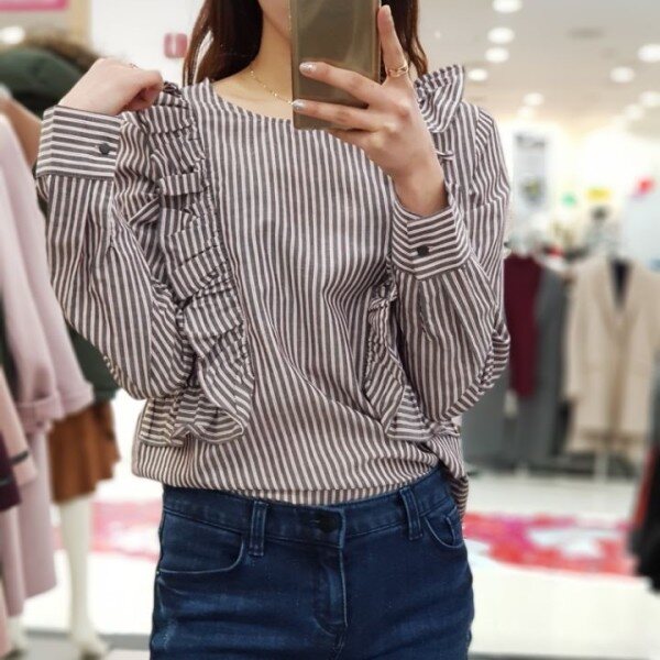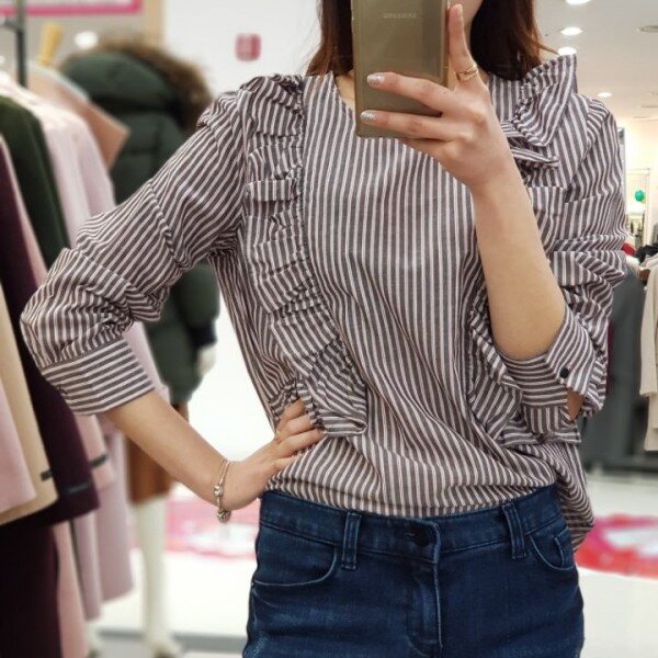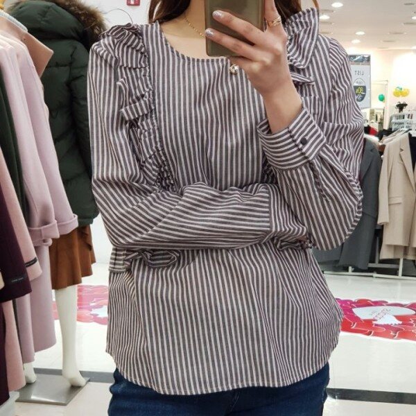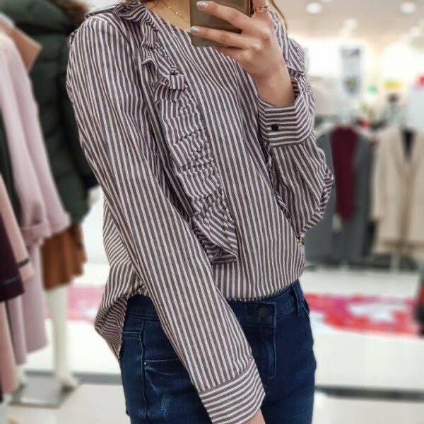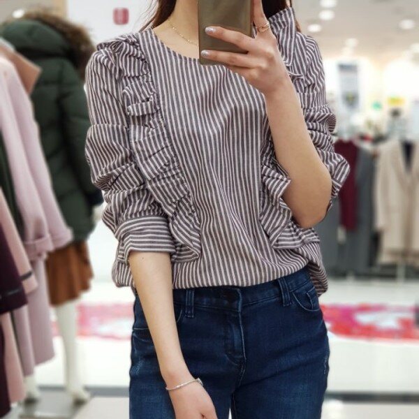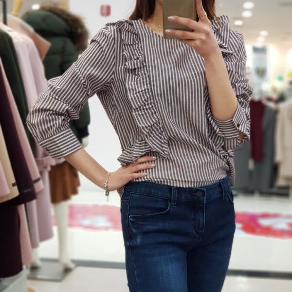 스트라이프 패턴과 러플이 매력적인 귀여운 분위기의 블라우스입니다.여성미와 귀여움, 스타일리시한 3박자를 두루 갖춘 상품입니다.진, 스커트, 원피스 등 다양하게 코디하기 좋아요.