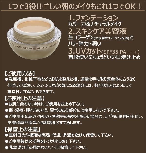 『ゲル』をベースに生コラーゲン(水溶性コラーゲン/保湿)を配合することにより、スキンケアのようなみずみずしい使い心地でありながら、同時にしっかりシミ・シワ・毛穴などをカバーしてくれるファンデーションです。伸びが良く、しかも、仕上がりは厚塗り感のないナチュラルな素肌メイクが期待できます。これ一つでファンデーション・美容液・UV日焼け止めの3役を果たします。 |