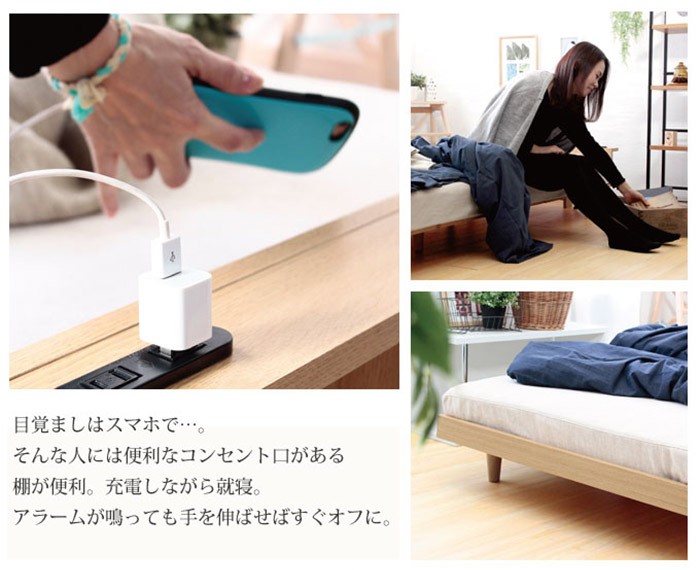 ●ヘッドボードにはスマホや雑貨が置ける棚スペースに、2口コンセント付で