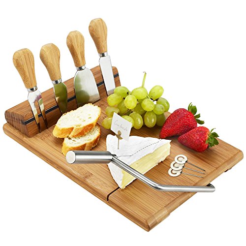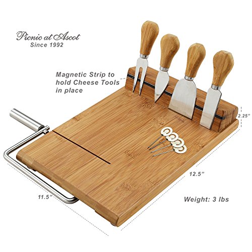 Picnic at Ascot Bamboo Board with Wire Cheese Slicer, 4 Stainless Steel Tools & Cheese Markers - A Great Holiday Gift for all Cheese Lovers