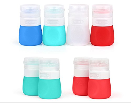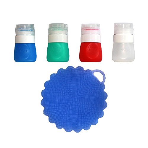 Features: Material- FDA Approved 100% food grade silicone Colour-blue, green, red, white Size: 37ML 55ML 85ML Leak proof flip top cap. BPA-free and safe. Easy and convenient way to transport your favorite dressing on-the-go Easy to squeeze silicone container Package included: 4 x salad dressing bottles and a high quality silicone dish scrubbers