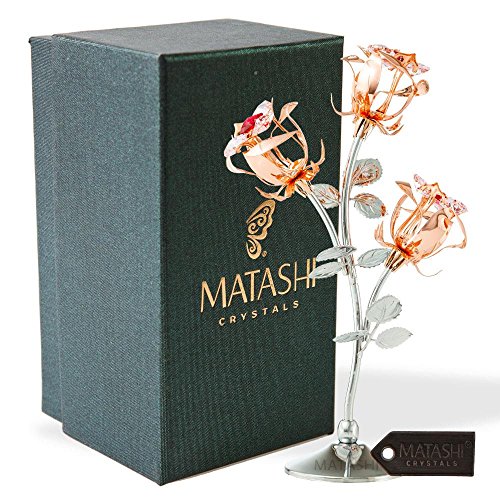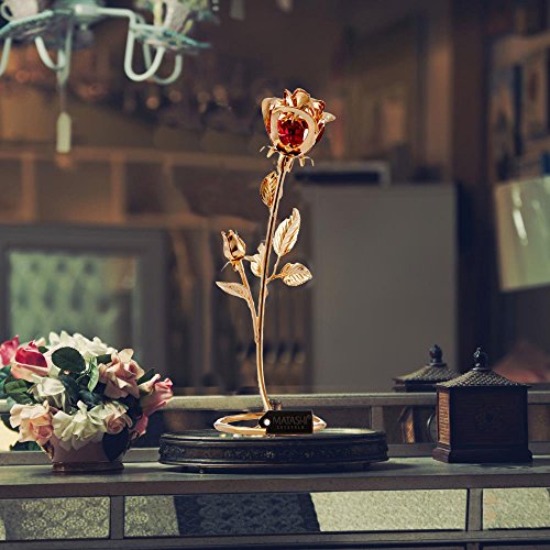 EYE-CATCHING DESIGN: Two stems curve outward from a single base. One ends with a petite gold rose and the other follows a gold leaf studded stem to a fully bloomed rose adorned with large red crystals. Crafted with 24K Gold and studded with precision cut Matashi® Crystals you can be sure of the highest quality materials