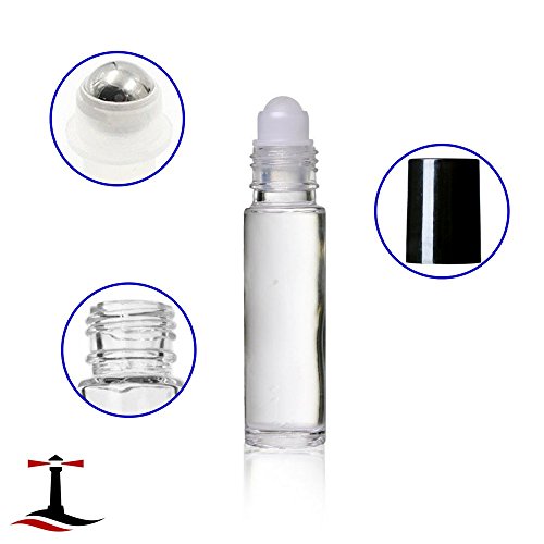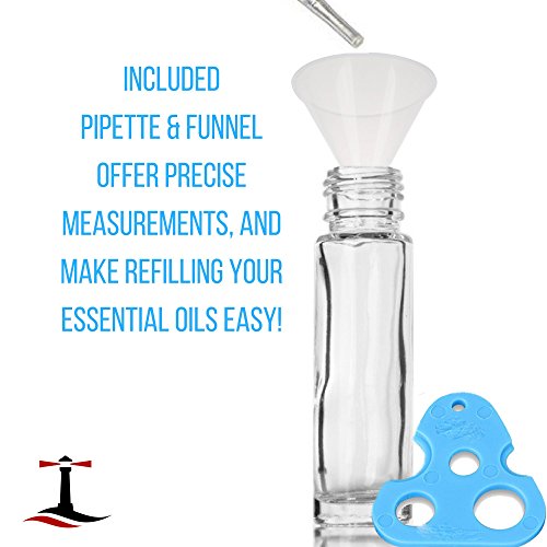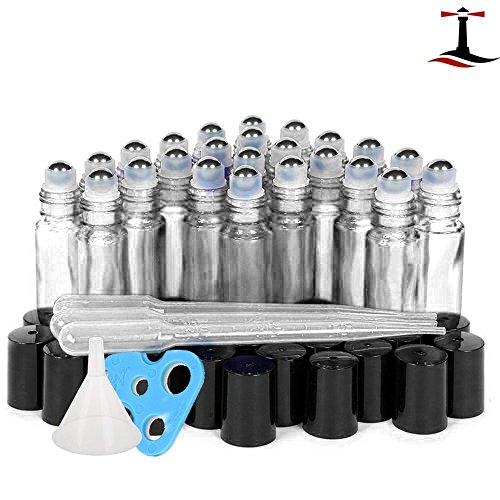 24 Glass Clear Essential Oils Roller Bottles Refillable 10 ml Roll On Perfume/Aromatherapy/Organic Beauty Bottles with Stainless Steel Roller Balls & Cap (3) 3 ml Droppers (1) Funnel (1) Opener