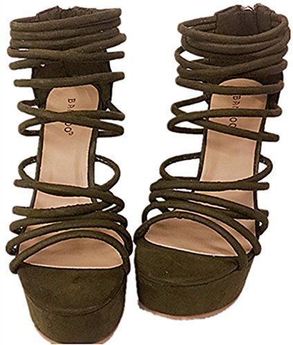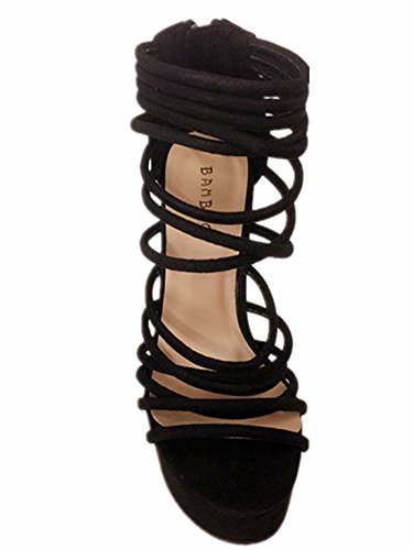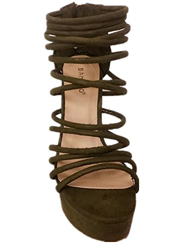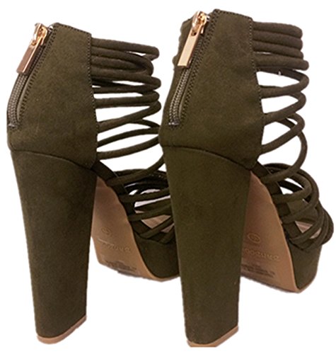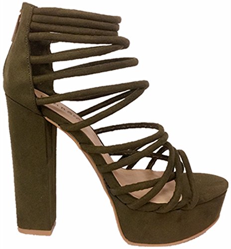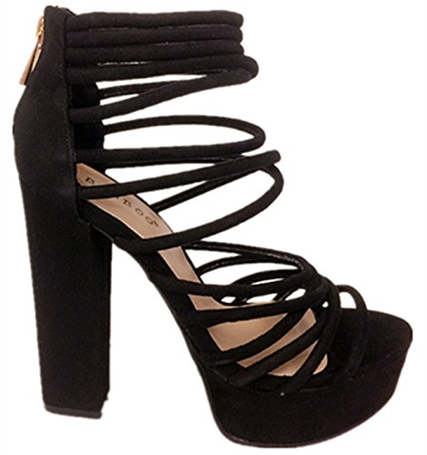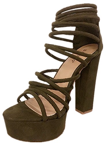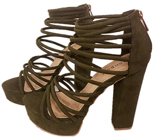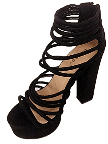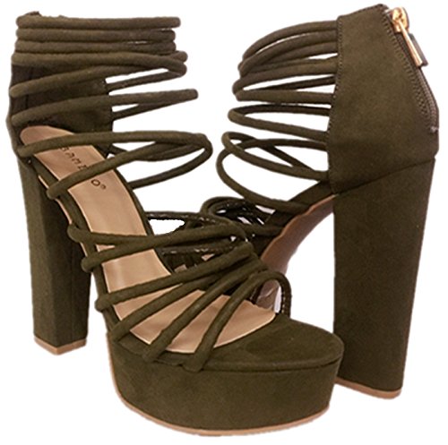 Product Description This trendy open toe heel features a tubular strappy silhouette, covered platform, and chunky wrapped heel. Finished with a lightly padded insole and rear zipper closure for easy on/off. 0