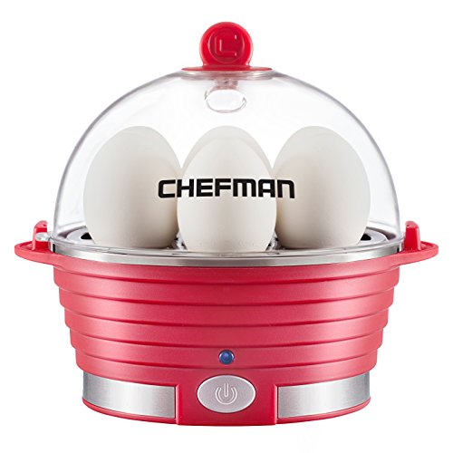 How do you like your eggs? Have them the way you like best. Cooked hard or soft, Poached or Scrambled, you can now easily do it all with the Chefman Egg Cooker. Decide on how you prefer your eggs, pour water into the heating plate, place the desired tray and eggs, cover, and your eggs are cooking with the push of a button. No mess afterwards, since the trays and measuring cup are dishwasher safe. Created with you in mind, the RJ24-V2 Egg Cooker will definitely change your hectic mornings and serve your family a healthy meal. Your eggs can be garnished to your likings, too. You will find easy and clear instructions in the manual on how to use your Egg Cooker and how to customize the settings so your eggs will be made perfectly. When choosing the Chefman RJ24-V2 you are making and excellent choice. You now have the assurance and peace of mind that this product has been manufactured to the highest standards of performance and safety, supported by the high quality standards of Chefman. The Chefman RJ24-V2 is backed by a comprehensive manufacturer's 1-year warranty and an outstanding after sales service through Chefman's dedicated Helpline. Poaches & Steams Eggs with Removable Tray - Modern Stylish Design - Red.Feature
