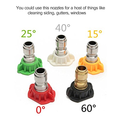 -. Feature : Spray Nozzle are made of high quality stainless steel and plastic materials, durable and not rust.Different spray angle allows you to clean hard-to-reach areas quickly and easily.Don't use a ladder to clean or spray water for tree with these spray. / Suitable to Most Pressure Washers up to 2700PSI(186BAR)/2.5GPM, 3000PSI(207BAR)/2.6GPM, 3200PSI(220BAR)/2.7GPM, 3600PSI(248BAR)/2.8GPM, 4000PSI (276BAR)/3.0GPM, 5000PSI (344BAR)/3.4GPM Max. / 5 different Spray Angle : Meet your need in different situations, such as watering flowers and plants, washing car, and can be attached to a quick-connect wand for swifter application and more. / Note:High pressure cleaner of the maximum flow can not be lower than the turbine nozzle GPM maximum, otherwise the turbine nozzle can not rotate, will not be able to achieve the effect of the rotating nozzle. / Package included :5 Pack-65 Degrees Brass soap nozzle, 0 Degrees Red Stainless Steel Nozzle Tip,15 Degrees Yellow Stainless Steel Nozzle Tip, 25 Degrees Green Stainless Steel Nozzle Tip, 40 Degrees White Stainless Steel Nozzle Tip.