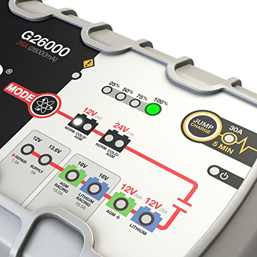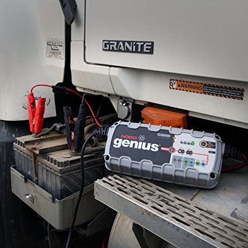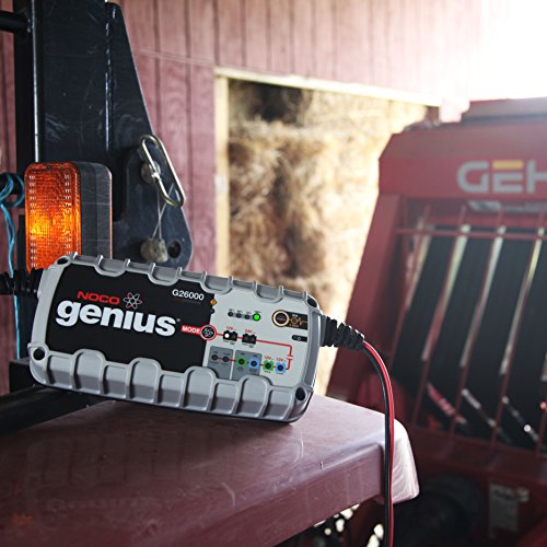 NOCO Genius Smart Battery Chargers are some of the safest and most advanced on the market. One of our best, the G26000 26A is designed to charge 12-volt and 24-volt lead-acid and lithium-ion batteries up to 500Ah. It can also effectively maintain automotive, marine, RV, lawn & garden and deep-cycle batteries. It charges 2x faster than ordinary chargers, can jumpstart dead batteries, repair damaged batteries, charge 16v racing batteries, power DC devices and is designed to use with micro-hybrid start-stop vehicles and CANBUS electrical systems. Guided by an onboard microcomputer, the G26000 monitors battery activity for safe and efficient charging, automatically minimizes energy consumption and provides redundant levels of safety protection, including spark-proof technology, as well as reverse polarity and overcharge protection. It can remain safely connected 24/7, while its streamlined design makes it ultra-compact, portable and incredibly lightweight. It features external mounting holes and a rubberized base that avoids surface slipping and scratches, all while remaining impact, UV and water-resistant (IP44). Intuitive LED indicators provide visual state-of-charge feedback and diagnostic information, even when in maintenance mode. Designed for use on 120-volt 50-60Hz electrical systems, the G26000 smart charger includes HD X-Connect battery clamps with detachable eyelet terminals and a 5-year limited warranty.Feature
