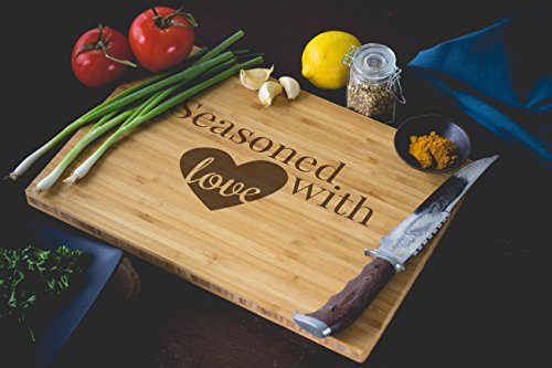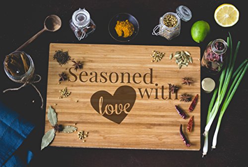 Seasoned With Love 15" x 10" Rectangle Carving Board, Heart Design, Bridal Newlywed Couple Housewarming Party