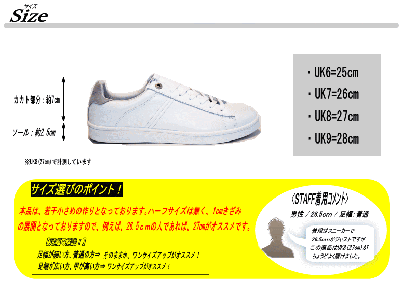 | サイズ | 作り⇒少し小さめ 【サイズ選びのポイント!】 足幅が細い方、普通の方⇒そのままか、1サイズアップがオススメ! 足幅が広い方、甲が高い方⇒1サイズアップがオススメ! |