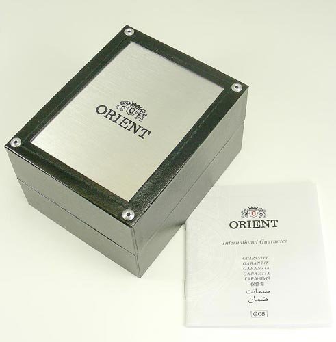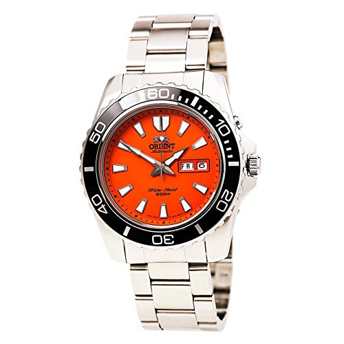 Orient Watch: Orient CEM75001M men's watch features brushed finish stainless steel case with black unidirectional rotating bezel and screw down crown & case back. This great watch also comes with high quality Japanese automatic movement, scratch resistant mineral crystal, water resistant up to 200 Meters, 8 1/2 inches brushed finish stainless steel bracelet with fold over safety clasp and orange dial with day-date display and luminous hands and hour markers.Feature