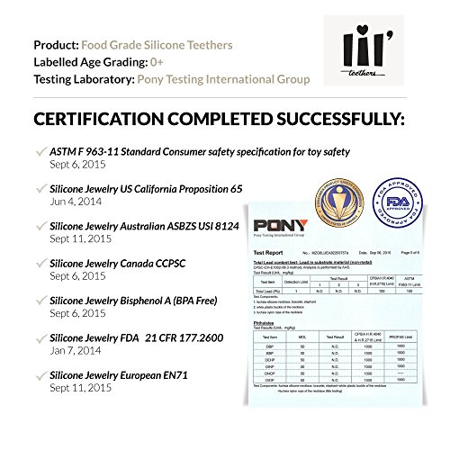 Lil Teethers have been passed by the FDA CPSC California Prop 65 as well as Canadian Australian and European authorities as a safe food grade silicone teether for healthy oral development. It is non-choking, non-toxic, BPA & Phthalates Free.