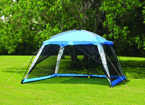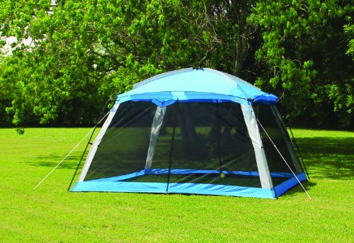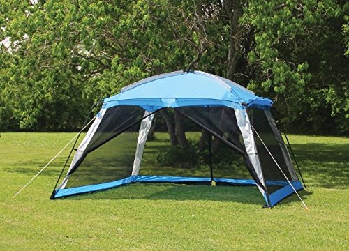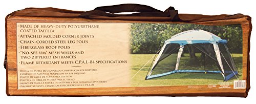 Product Description Measuring 12 feet square, this four-legged arbor has walls made of fine mesh to screen out insects as small as no-see-ums. Two of the walls zip open as entrances. The arbor provides 82 inches of headroom. Roof and panels are flame-retardant heavy-duty taffeta. Legs are rust-resistant 3/4-inch-diameter steel with molded joints. Fiberglass poles support the roof. Stakes and a carry/storage bag come with the arbor. Setup instructions are included.