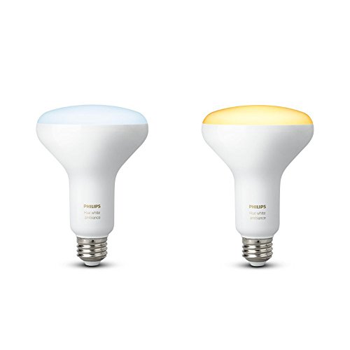 From sunrise to sunset, the Philips Hue White Ambiance BR30 Dimmable LED Smart Flood Lights change how you light your moments at home. With wireless control on your smartphone or tablet, choose the perfect light setting for any mood or activity such as reading or relaxing, concentrating, or energizing. Requiring the Hue Bridge (sold separately) for the full Hue experience, this BR30 LED smart flood light is designed to fit recessed cans and downlights. Install the LED light as you would install ordinary bulbs, pairing them with the Hue Bridge, which allows you to control smart-bulb-equipped lights via the Philips Hue App. Easily expand your smart lighting system with Hue accessories (sold separately), such as a Hue Dimmer Switch, Hue Tap, or Hue Motion Sensor. Pair it for automation with your existing Nest or Samsung SmartThings system. This box includes two Philips Hue White Ambiance BR30 light bulbs, manual, and two-year warranty.Feature