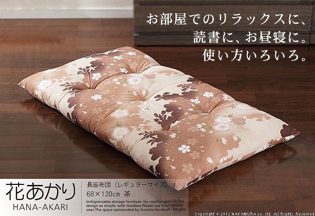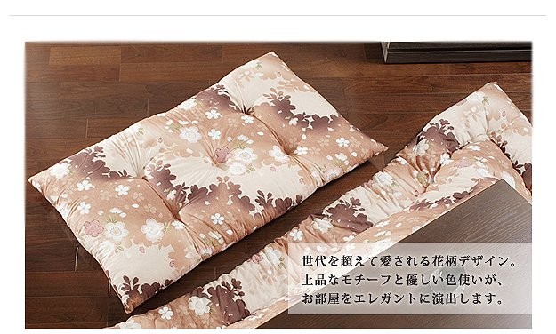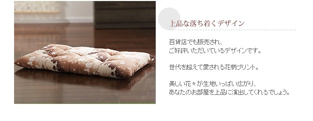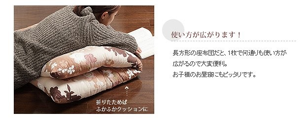 商品について:優しい花のモチーフと色合いが上品な国産の長座布団です。脚を伸ばして座れるサイズで使い方色々。折りたたんで枕やクッション代わりにしたりと、便利な座布団です。中綿はたっぷり☆うれしいボリューム感です。お洗濯は専門の業者にご相談ください。