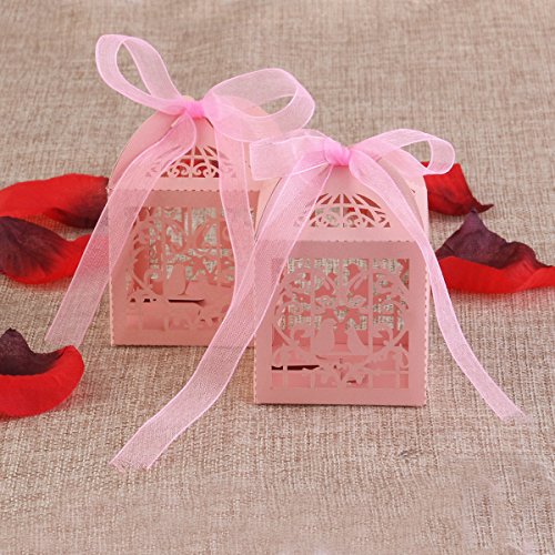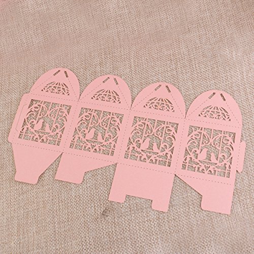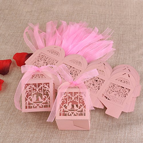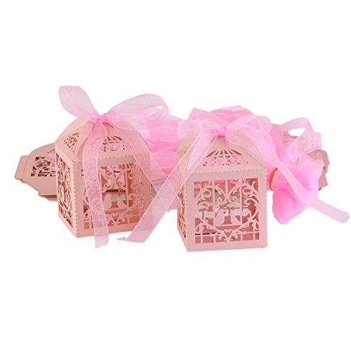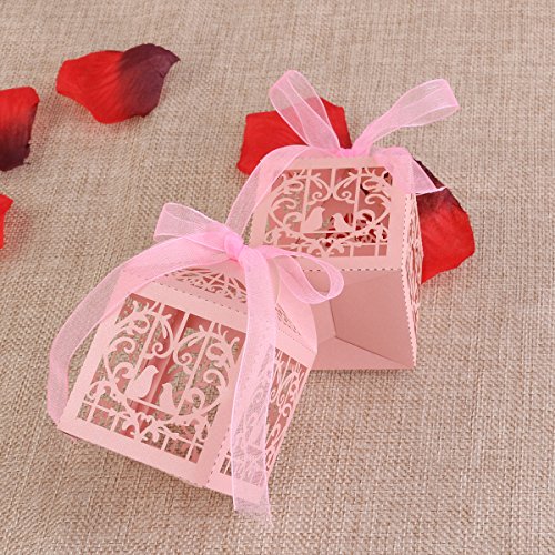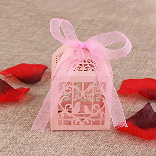 Tinksky 50pcs Floral Heart Bird Wedding Party Favor Candy Box Pink Gift Box with Ribbon