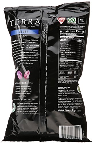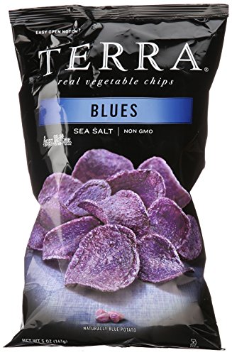 -. Binding : Grocery -. Brand : Terra -. EAN : 0728229679011 -. Feature : Real vegetable chips / Made with naturally blue potato / Made with non-GMO ingredients / No artificial flavors or preservatives and gluten-free -. Label : Terra -. Manufacturer : Terra -. PackageQuantity : 1 -. ProductGroup : Pantry -. ProductTypeName : GROCERY -. Publisher : Terra -. Studio : Terra -. Title : Terra Blues Chips, Sea Salt, 5 Ounce -. UPC : 728229679011
