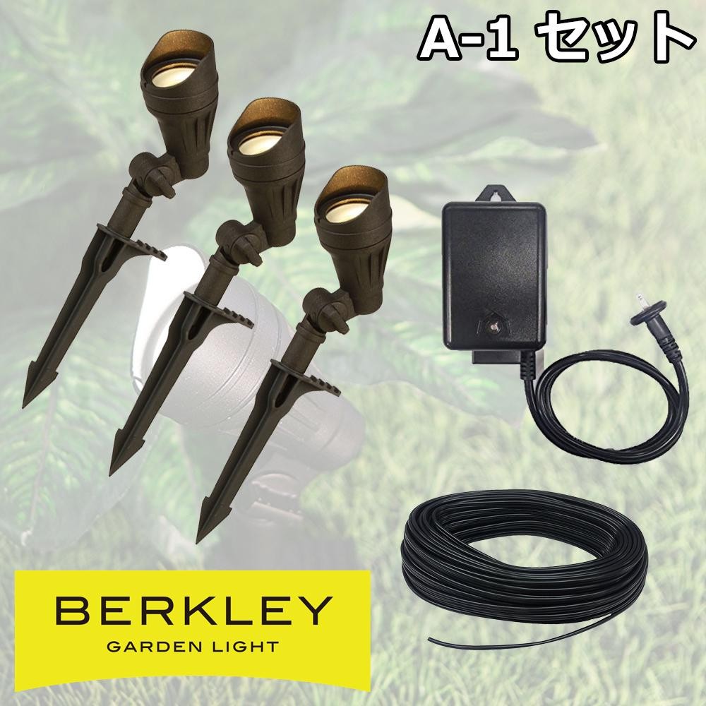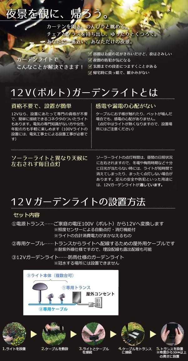 照らしたい対象をピンポイントに絞って投光できる挟角の防雨仕様のスポットライト3本と、ご家庭の電圧100Vから12Vへ変換する電源トランスと、トランスからライトへ配線するための屋外用ケーブルがセットになっていてお得です。 |