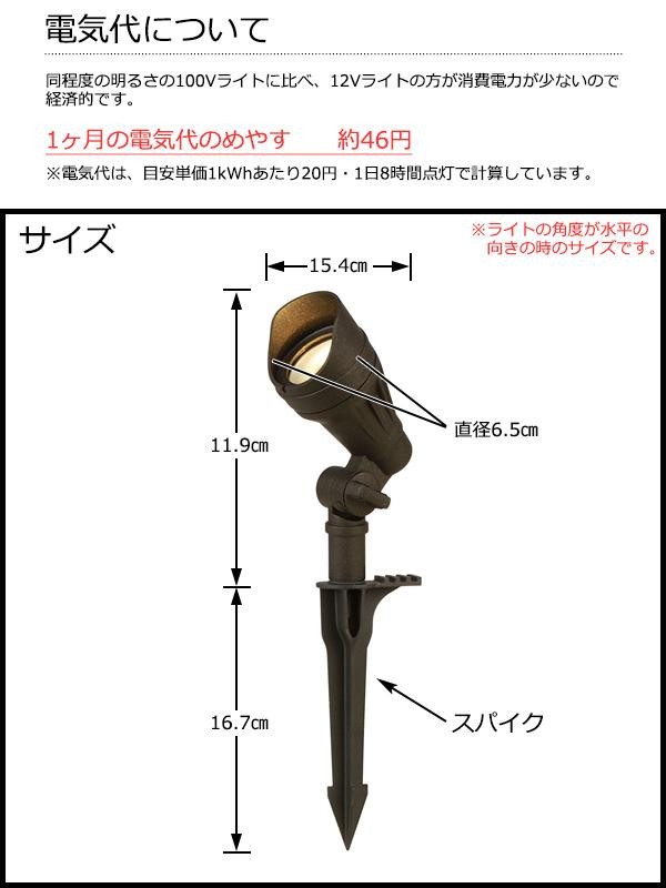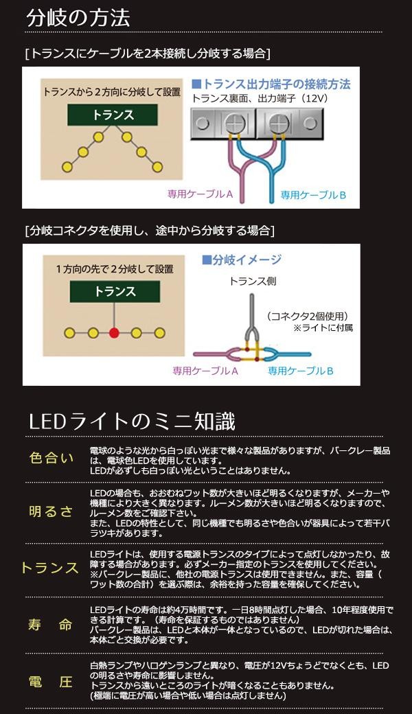| 仕様 | ※LEDライトをあと50Wまで追加可能 【ライト】 3.2WLED 色温度:3000K(電球色) 全光束:240ルーメン 電圧:12V 定格寿命:約40000時間 配光角度:35度 照射距離めやす:3m(周囲の明るさによって変わる) 黒色 防雨型 LED交換不可 メーカー指定以外の電源トランスは使用不可 スパイク(杭)・接続コネクタ・取扱説明書・保証書(保証期間:3年)付 【電源トランス】 入力電圧:AC100V 出力電圧:AC12V 周波数:50/60Hz 容量:60W 電源コード長さ:約1m 防雨型 照度センサー付 自動ON/OFF 据付用ネジ・取扱説明書・保証書(保証期間:1年)付 【ケーブル】 電圧:12V 耐紫外線屋外用 AWG16(約1.3mm2) 長さ:10m |