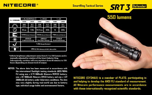 Nitecore 550 Lumens SRT3 (Option: Gray or Black) Defender SmartRing Tactical Flashlight with LumenTAC CR123A Battery