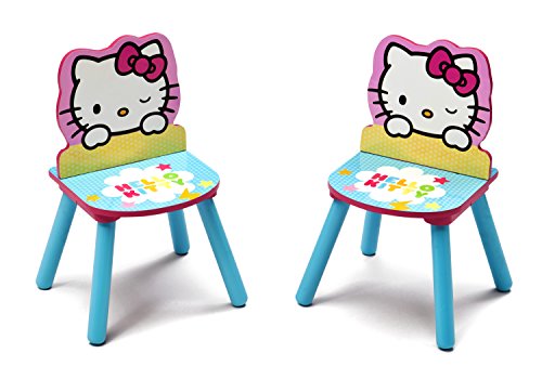 Featuring a spacious tabletop, this Hello Kitty Table & Chair Set boasts colorful graphics of girls' favorite feline, along with two coordinating chairs that showcase Hello Kitty's iconic silhouette.