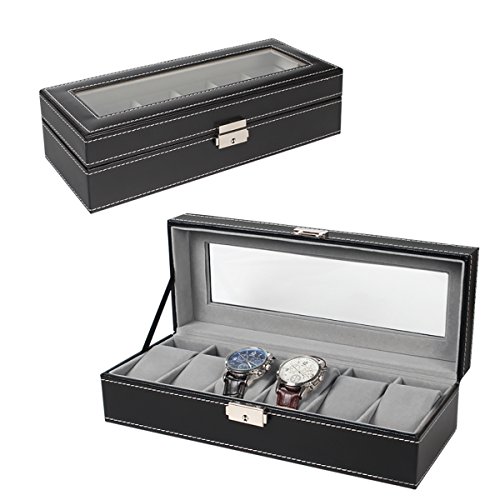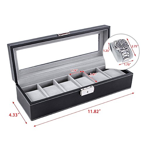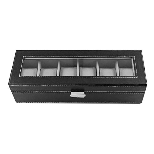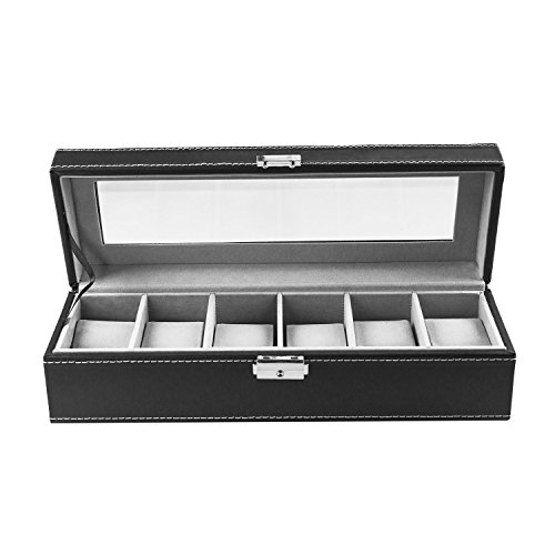 6 Slot Leather Watch Box Display Case Organizer Glass Jewelry Storage Black