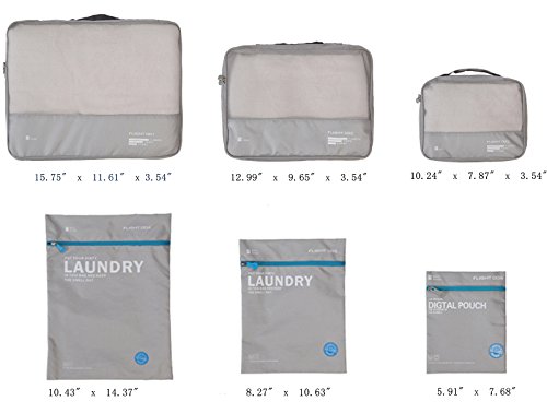 3 Travel Packing Cubes:(15.75''x11.61''x3.54'') +(12.99''x9.65''x3.54'')+(10.24''x7.87''x3.54'') ; 2 Compression Pouches:(14.37''x10.43'')+(10.63''x8.27''); 1 Digtal Pouch:(7.68''x5.91'').