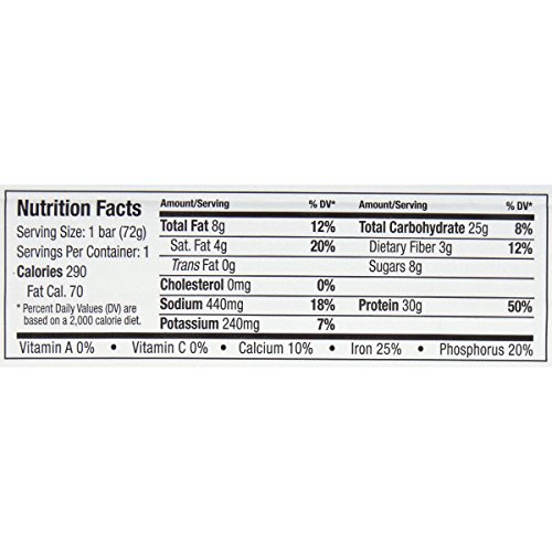 Each bar contains 30g protein, 3g Fiber, 10 percent DV Calcium, 20 percent DV Iron