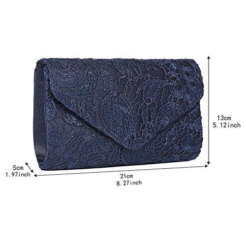 -. Feature : W8.26, H5.11, D1.96" (21*13*5cm) / Features - Elegant satin clutch bag with a beautiful floral lace on the front; Glamorous party handbags avaible 3 stylish that can be used as a clutches, shoulder bags or cross-body bags; / Magnetic Snap Closure with detachable shoulder strap; fully lined inside and has a small pocket. / Capacity - You can easily fit your cell phone (fit for iPhone 6s plus), cards, money, car keys, small wallet, mirror, lipstick, some makeup etc / Suitable for wedding party, family reunion, prom, banquet and cocktail party and so on.