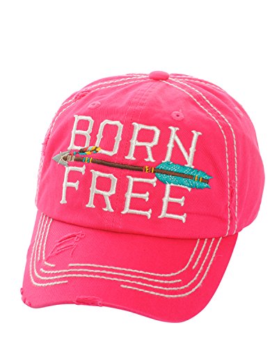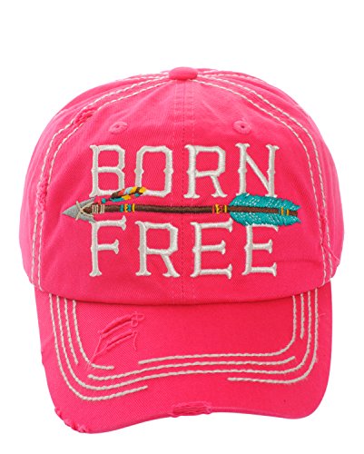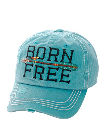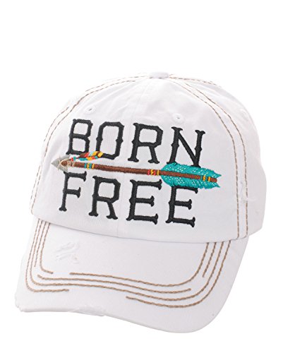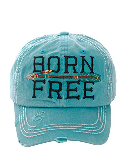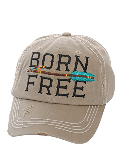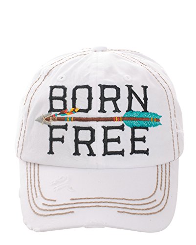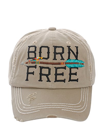 Product DescriptionEmbroidered "Born Free" with Arrow, Distressed Torn Vintage Style, Velcro Size Adjuster on Back, Material : 100% Cotton, Size : 7.50"(L) X 7.50"(W) X 3.75"(H) - Brim Length: 3"0