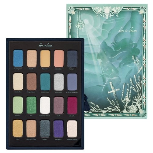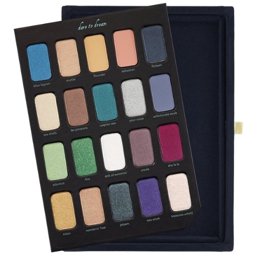 - 20 x 0.035 oz eye shadow in: - Blue Lagoon (shimmering blue) - Scuttle (shimmering pinky beige) - Flounder (matte nude) - Sebastian (matte coraly pink) - Flotsam (deep blue charcoal) - Sea Shells (shimmering ivory) - Les Poissons (dusty satin mauve) - Caspian Sea (shimmering rich turquoise) - Your Voice (glistening silver pearl) - Unfortunate Souls (matte lavender grey) - Atlantica (shimmering sea foam green) - Fins (glittery mermaid green) - Sick Of Swimmin'' (shimmering opalescent) - Ursula (pearly purple) - Sha La La La (matte dark fuchsia) - Triton (shimmering gold) - Wanderin'' Free (shimmering pink champagne) - Jetsam (deep teal with dark iridescent glitter) - Sea Witch (pearly violet) - Treasure Untold (opalescent pale pink)